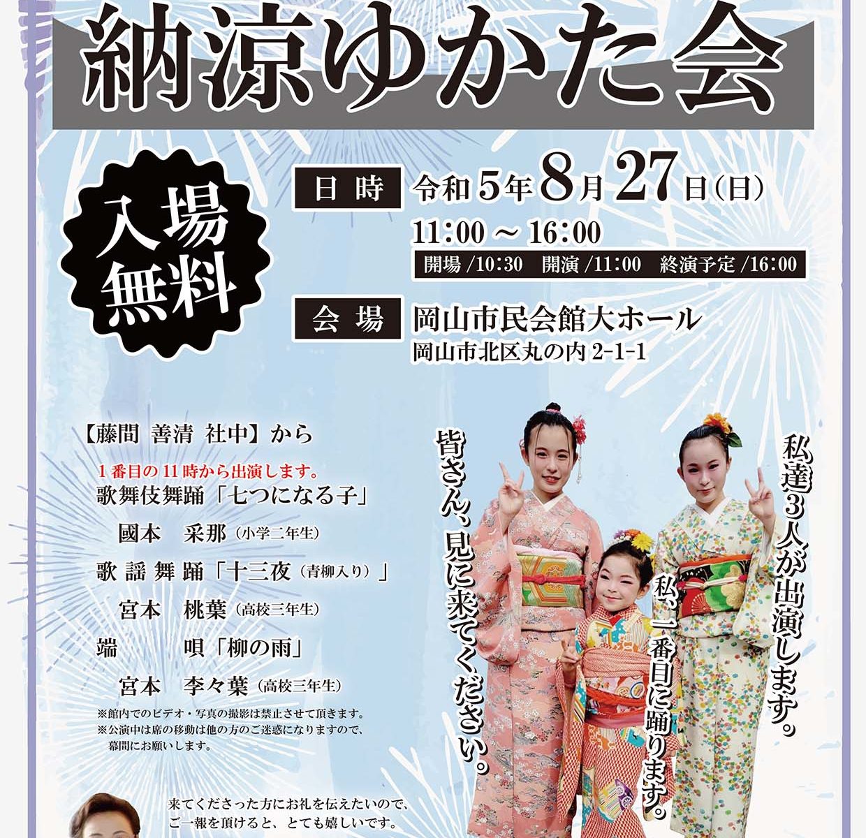 藤間流邑清会から日本舞踊、前結び教室の生徒さんによる様々な帯結びを披露いたします。