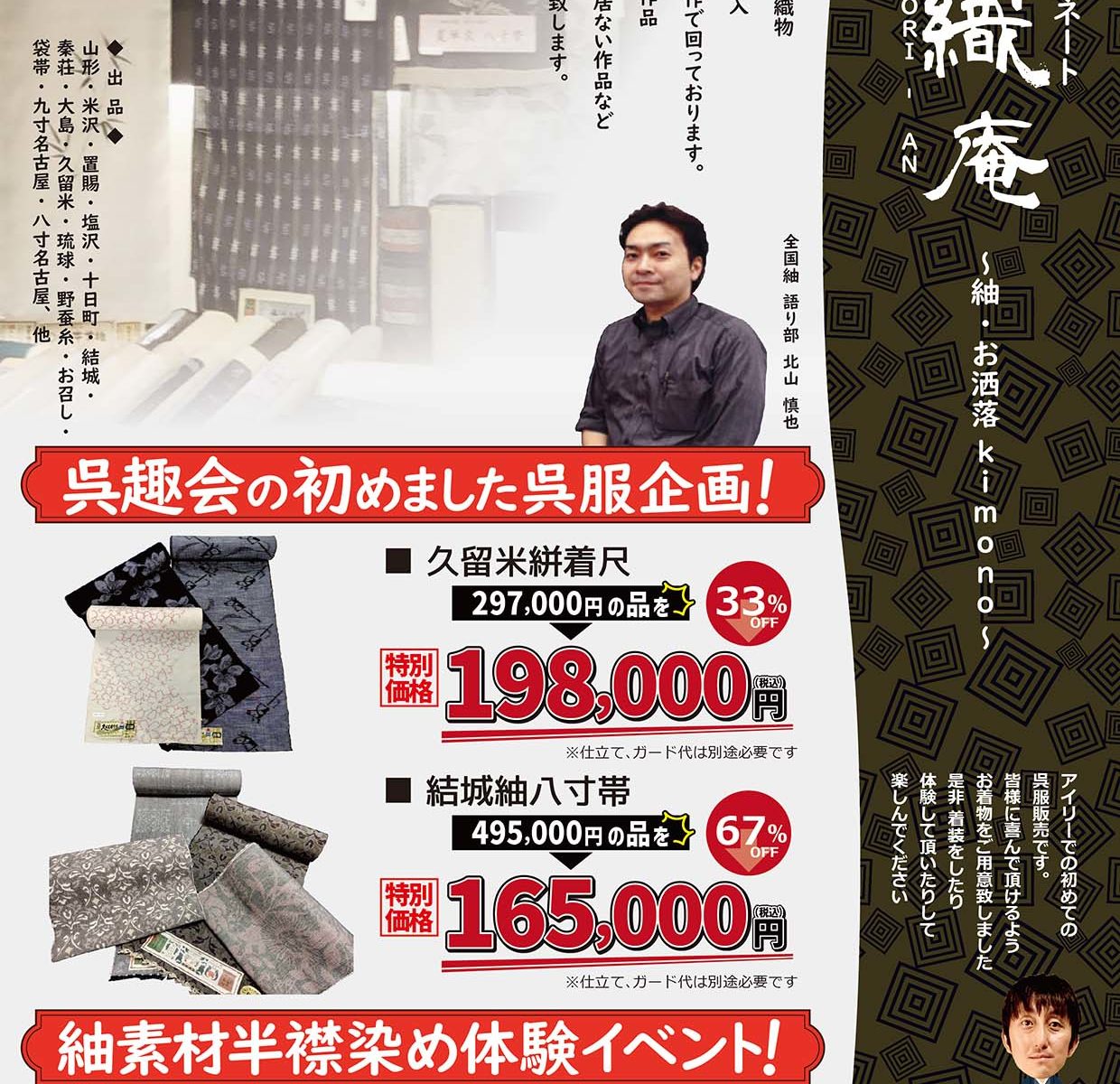 今回は、店長50歳記念という事で、反物(紬・小紋など)を半額でご用意しています。