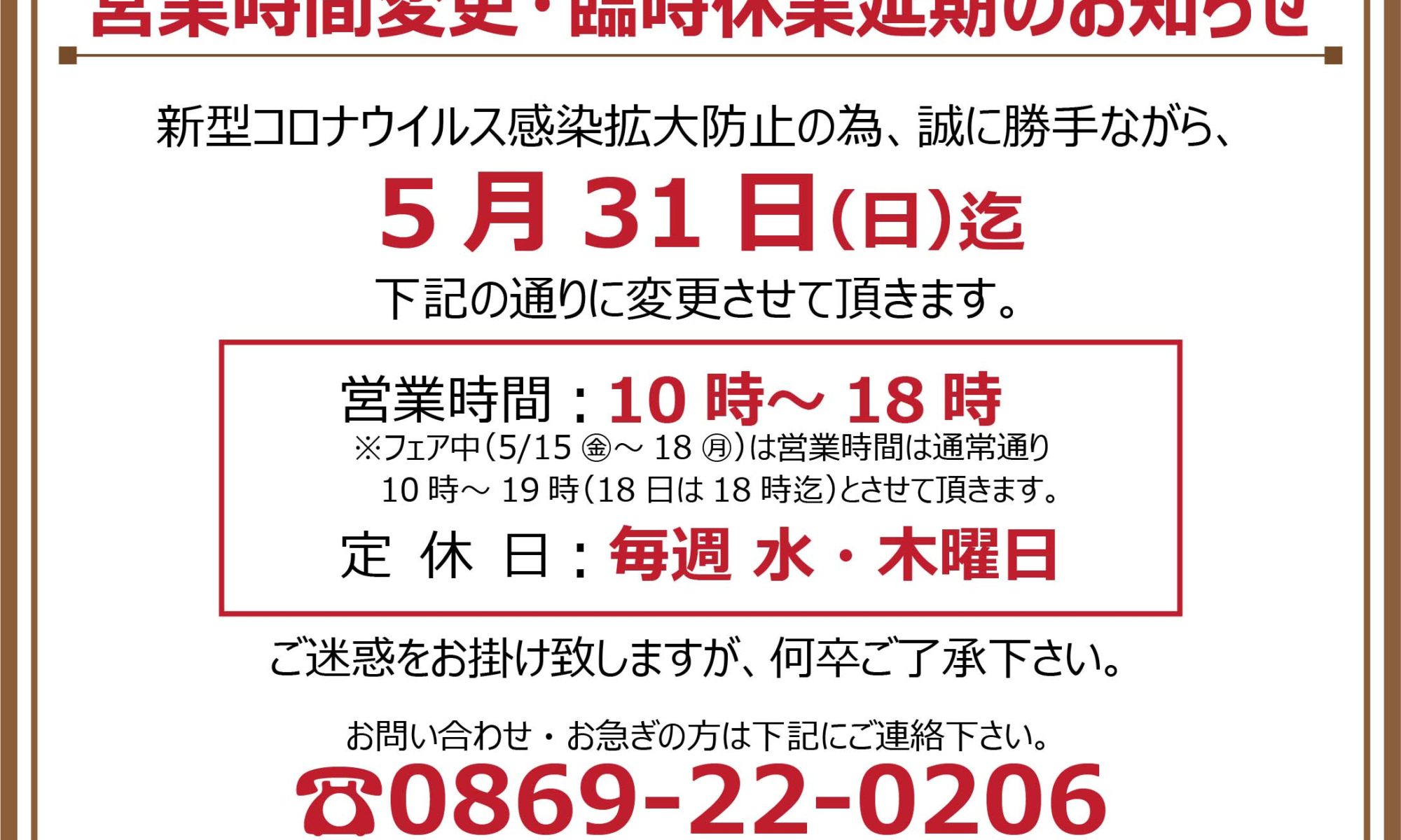【5/31まで営業時間と定休日が変更になります。】
