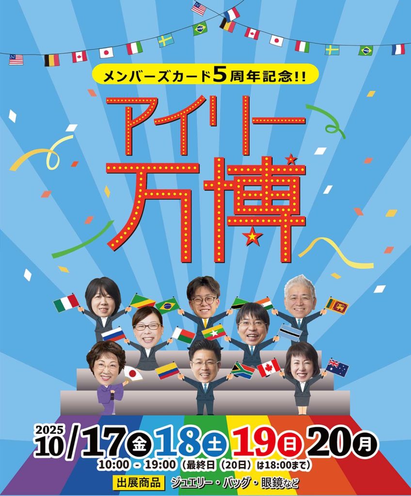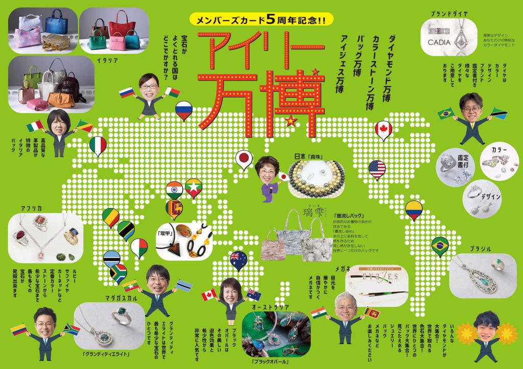 一年に最も多くのお客様の来られるこの機会にメンバーズカード5周年記念「アイリー万博」を開催いたします。「世界中のジュエリーこんにちは!」をテーマに万博級の品ぞろえ、感動の超特価でジュエリー・バッグなどを超特価で販売いたします。