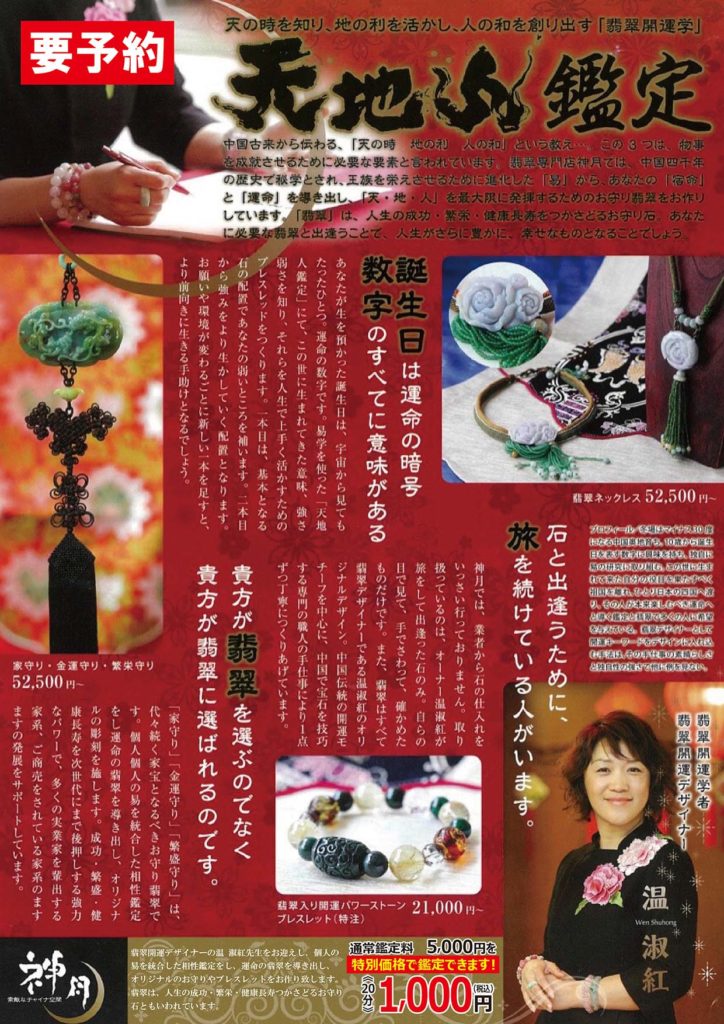 翡翠開運デザイナーの温 淑紅先生をお迎えし、個人個人の易を統合した相性鑑定をし運命の翡翠を導き出し、オリジナルのお守りやブレスレットをお作りするイベントを開催する運びとなりました。